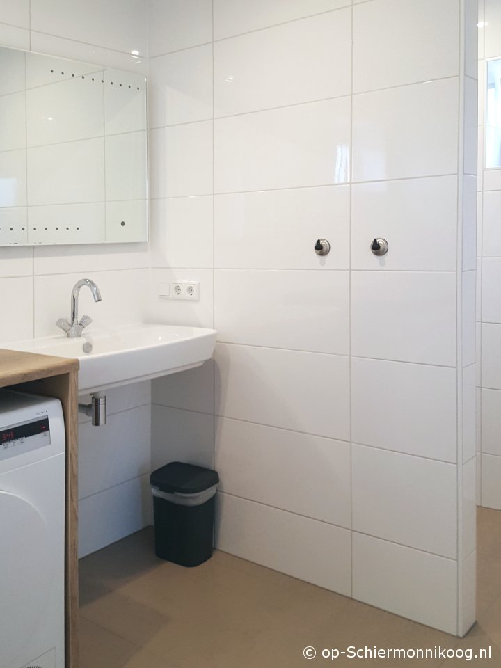 Duschraum mit Sitzgelegenheit, Waschbecken, Waschmaschine, Trockner und Möglichkeiten für Babyversorgung.