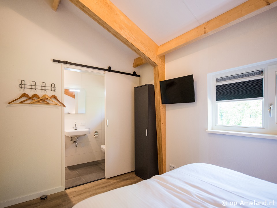 - 1 mit Doppelbett mit eigenem Bad, Dusche, Waschbecken und Toilette und Smart TV