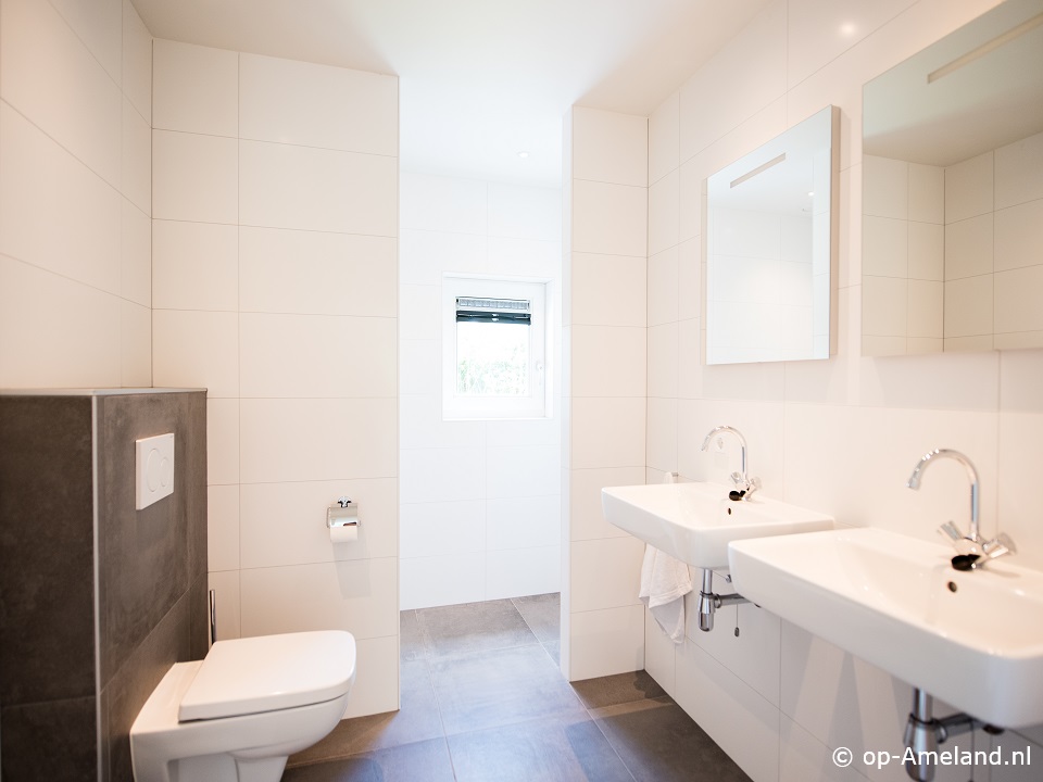 Zweite Badezimmer mit Dusche, Doppelwaschbecken und Toilette.